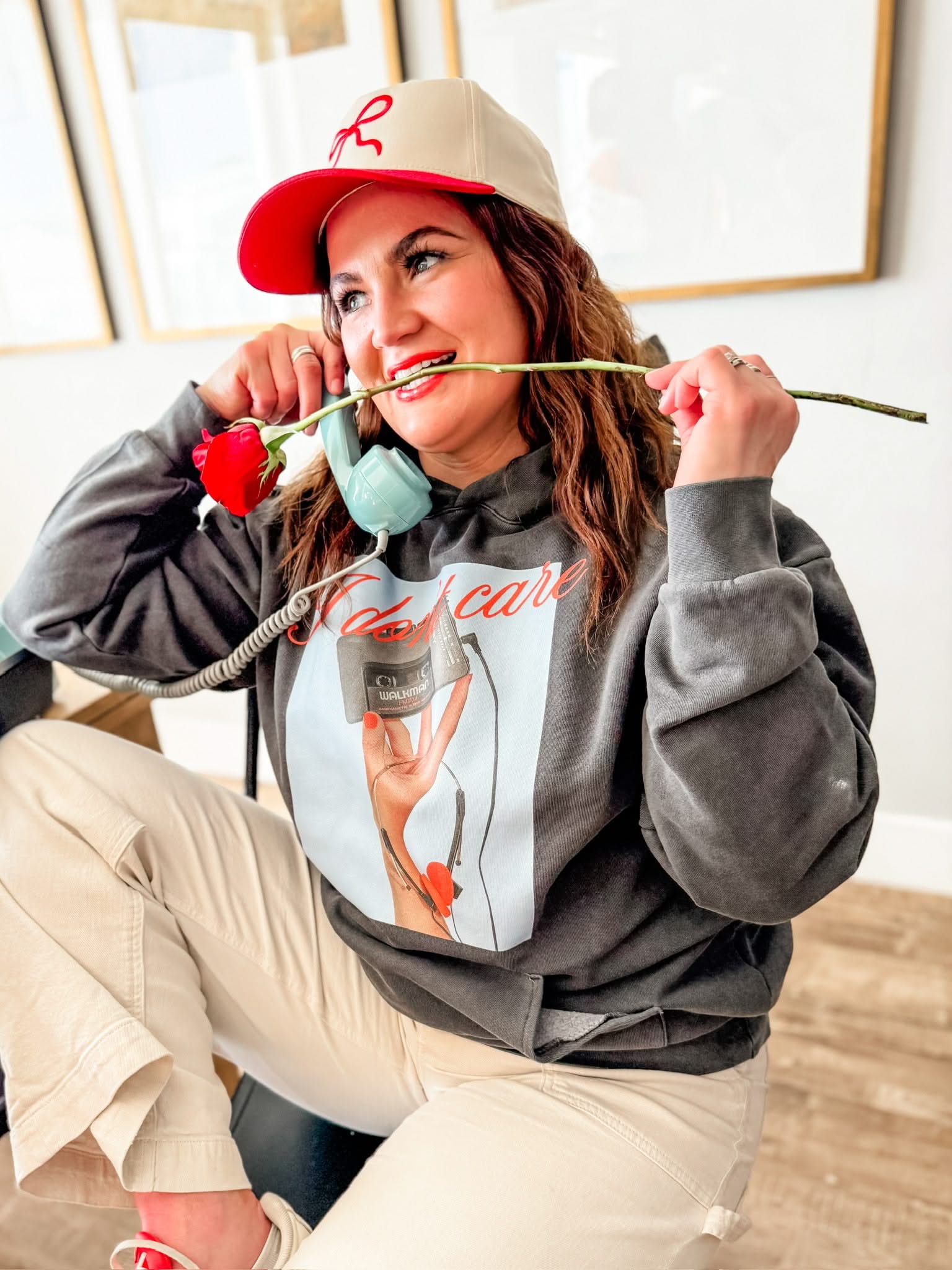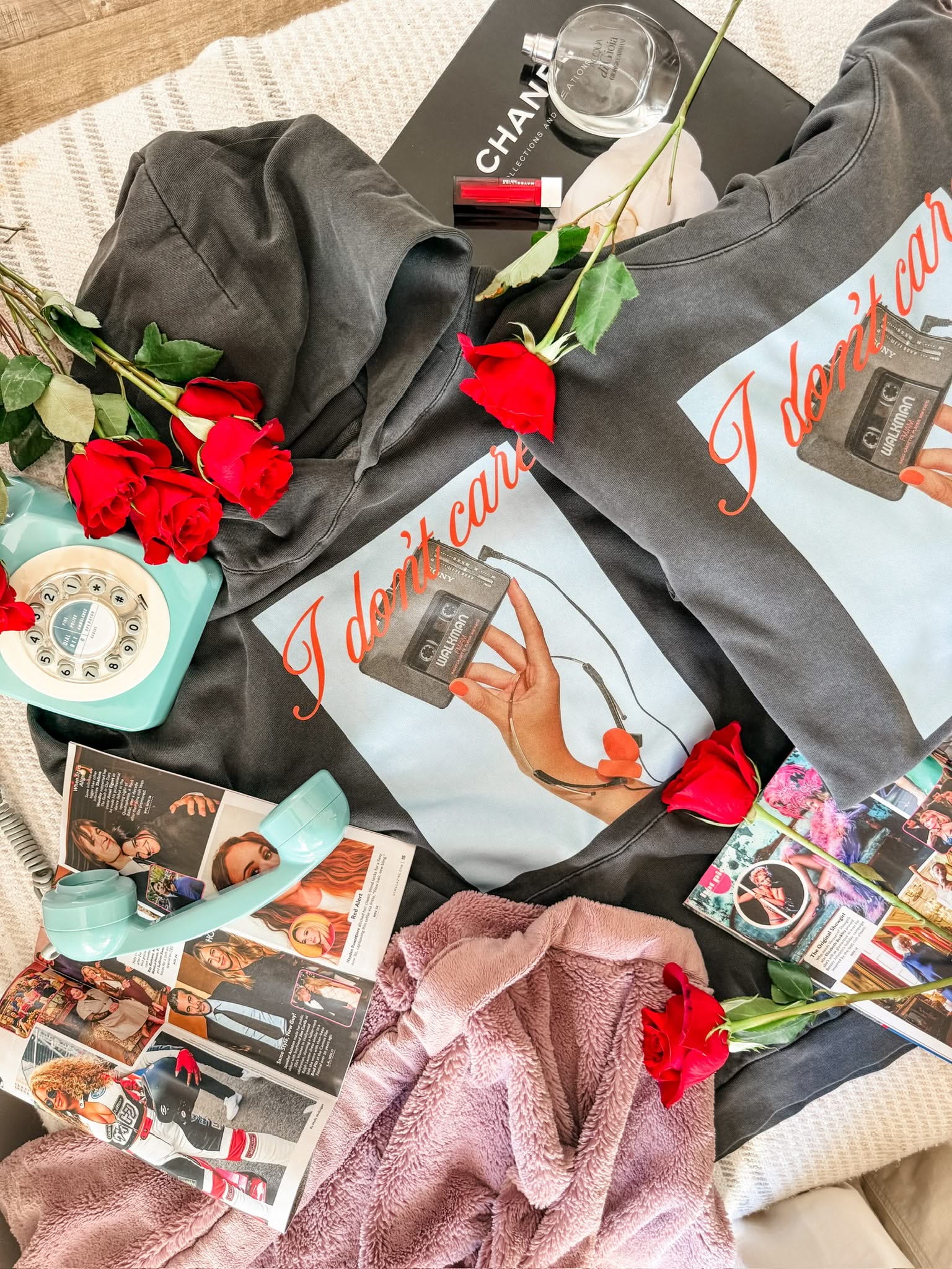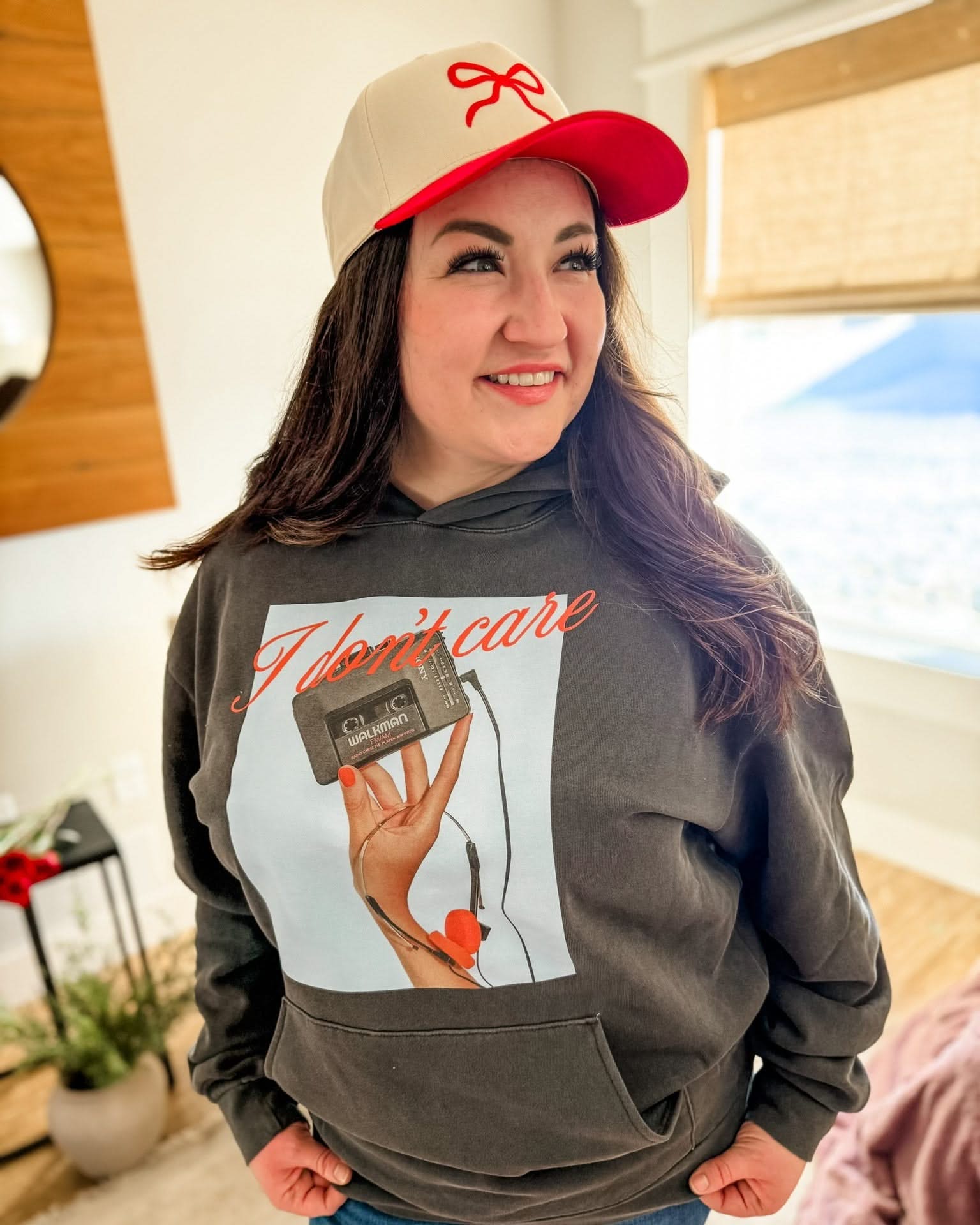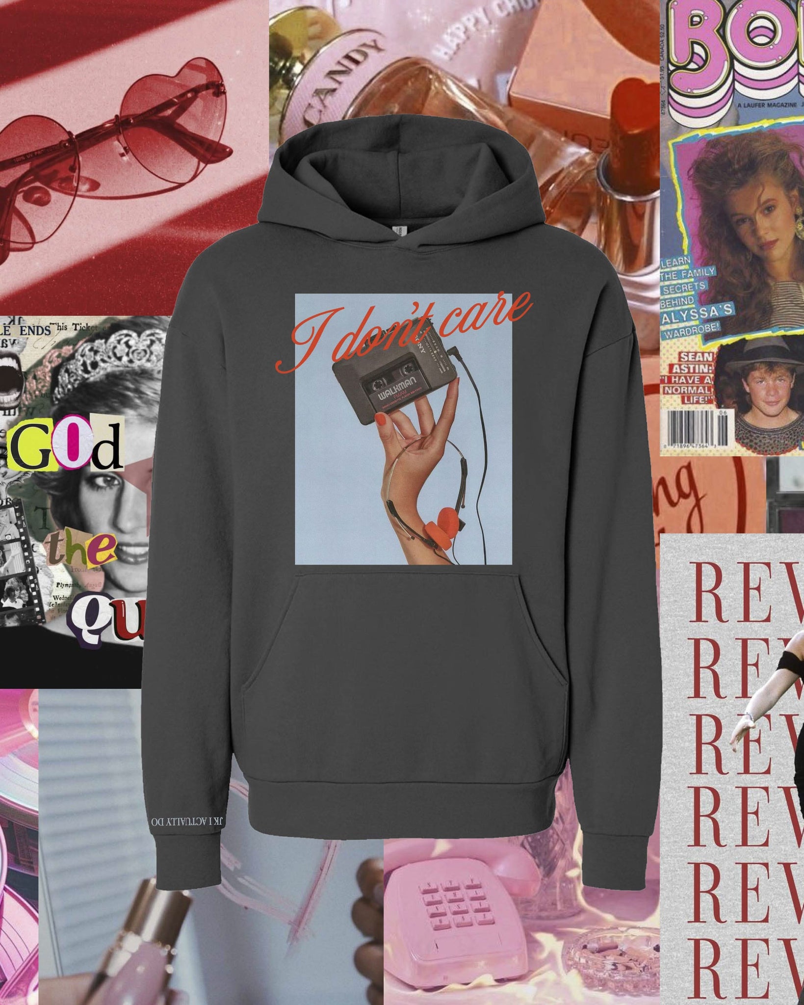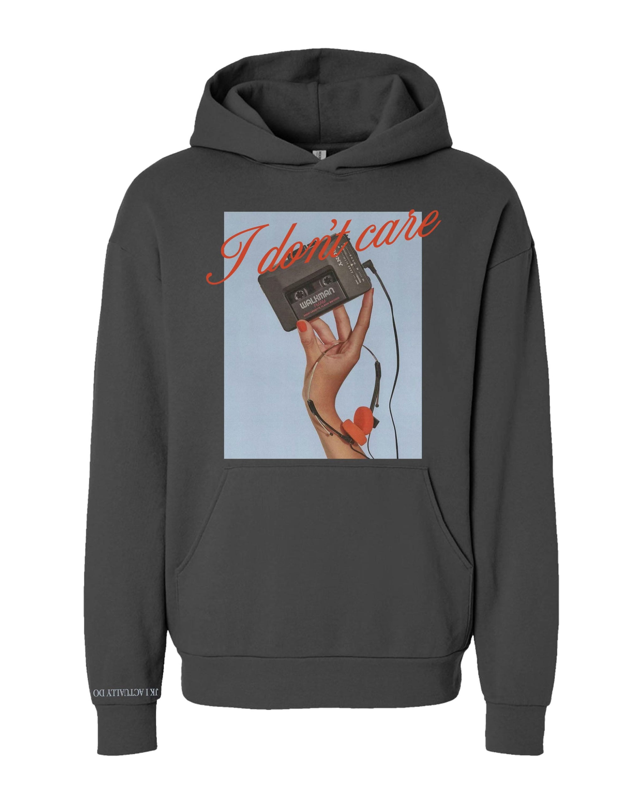 The I Don’t Care Pigment Black Hoodie is the ultimate cozy statement, combining a vintage-washed fleece with a bold retro cassette graphic and "JK I Actually Do" text on the sleeve.