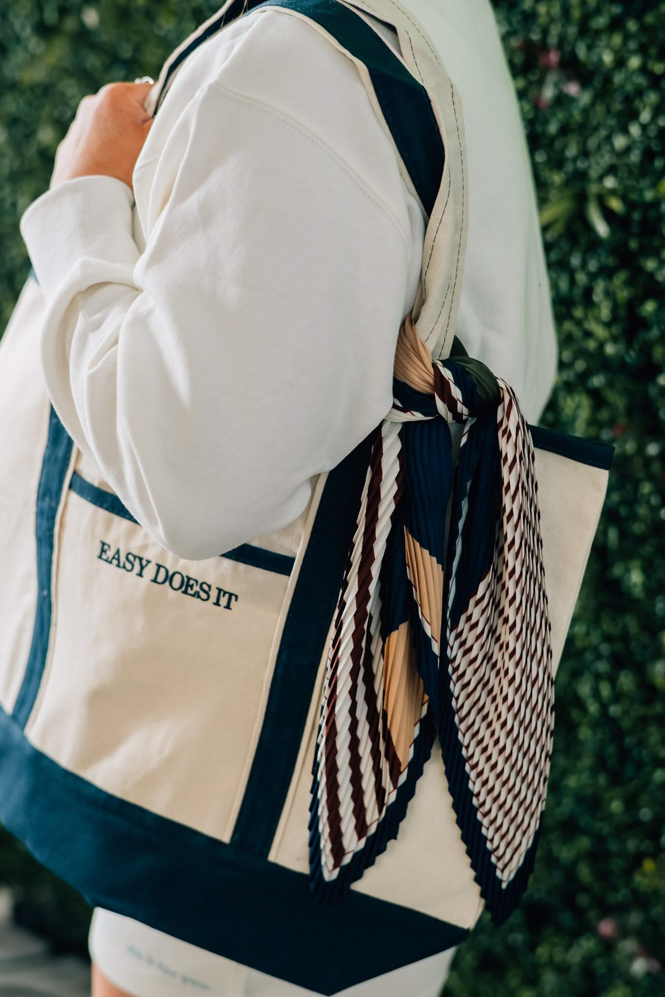 Includes a pleated, patterned scarf for a little extra something. (Tie it on the handle. Wear it in your hair. Style it your way.)