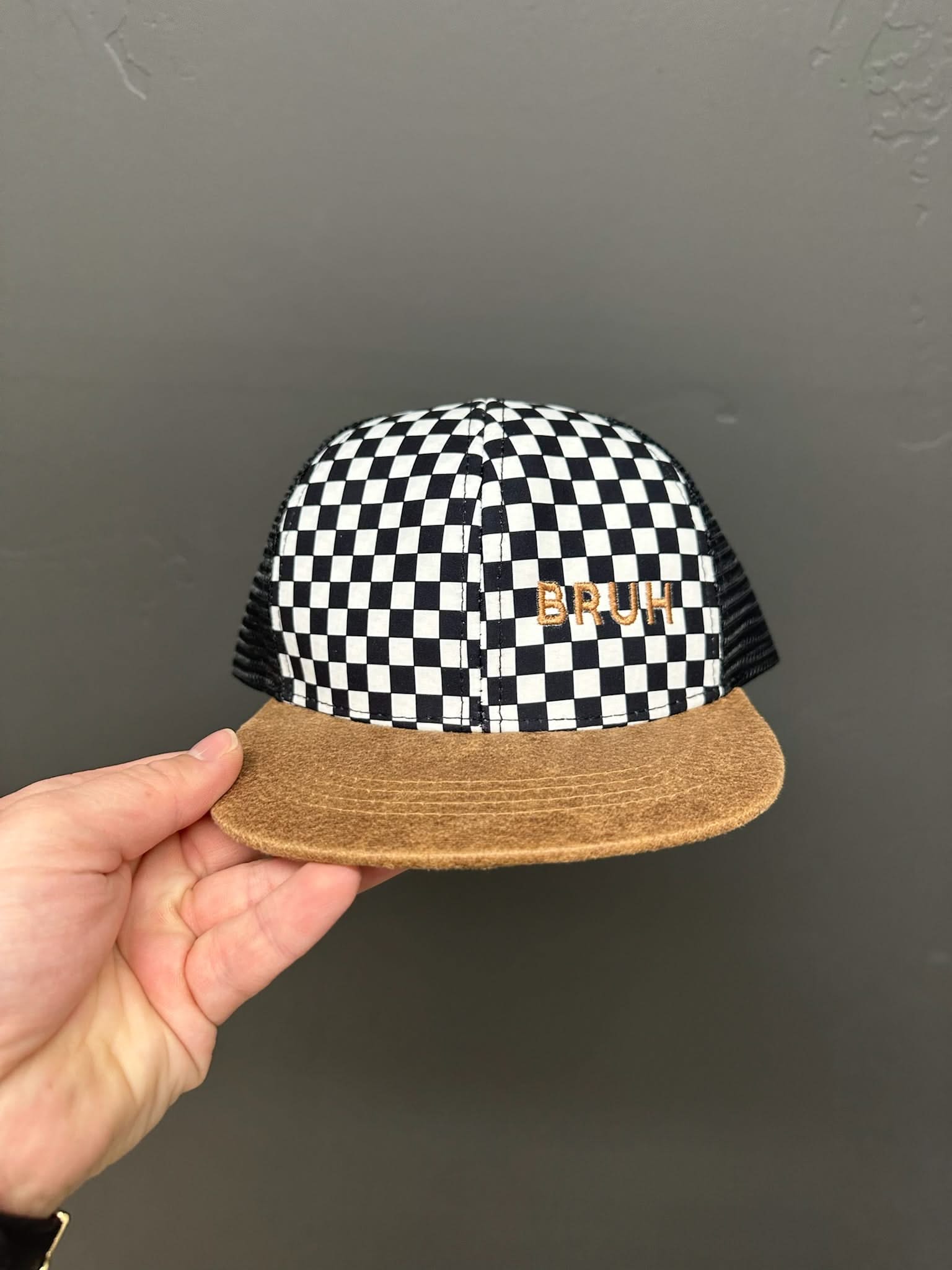 Checkered hat with “BRUH” embroidery in brown thread