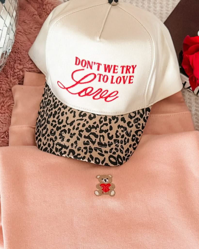 Leopard Trucker Hat – Don’t We Try to Love Love Embroidered Cap | Little Mama Shirt Shop